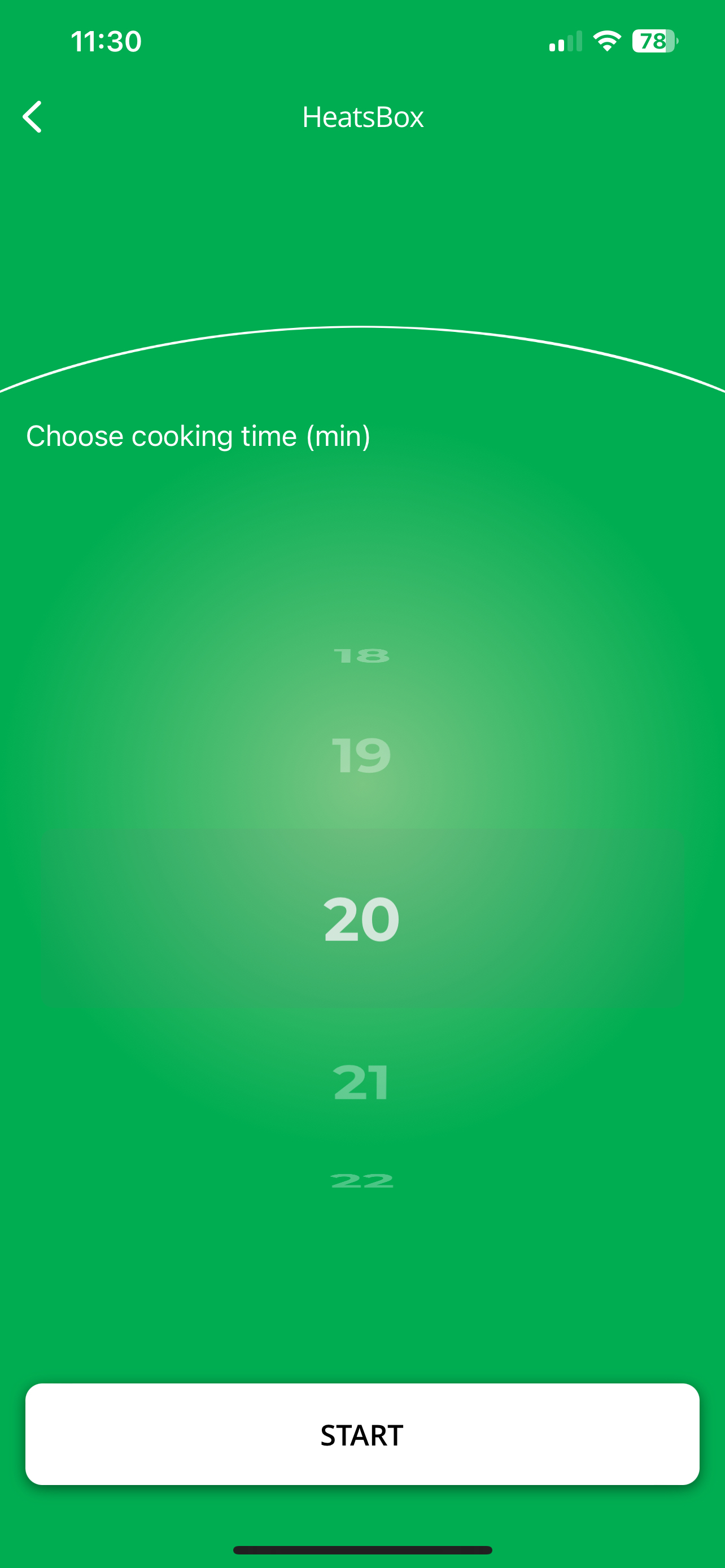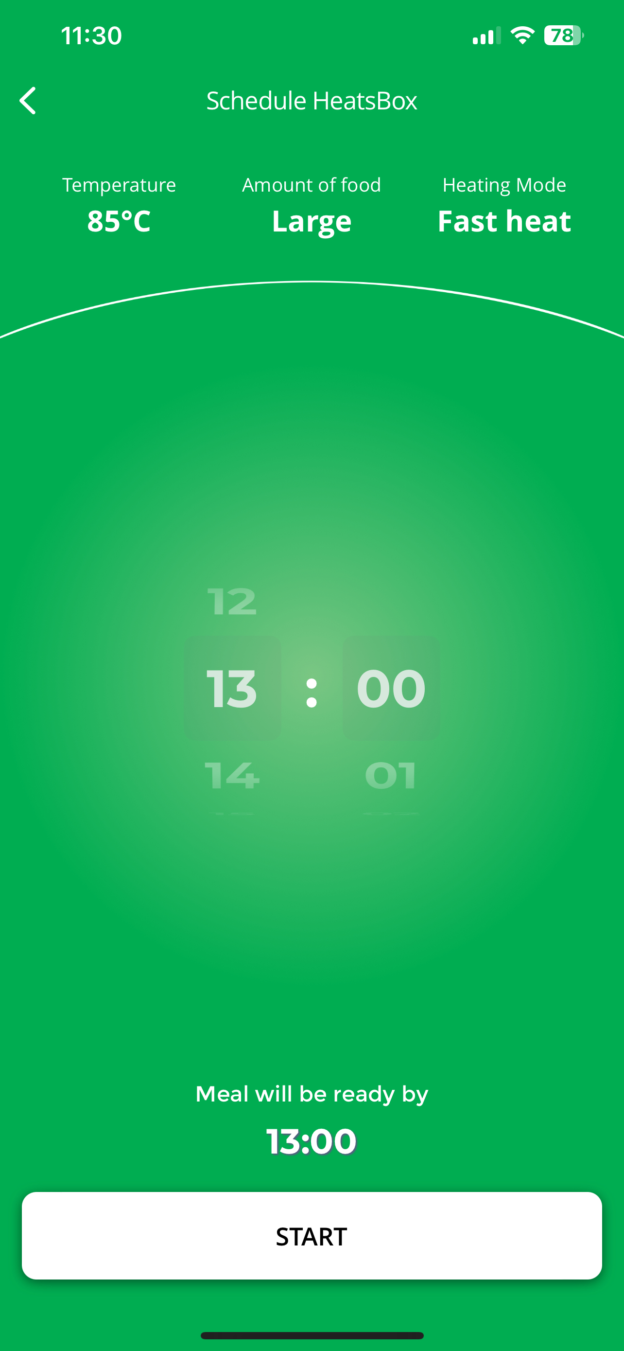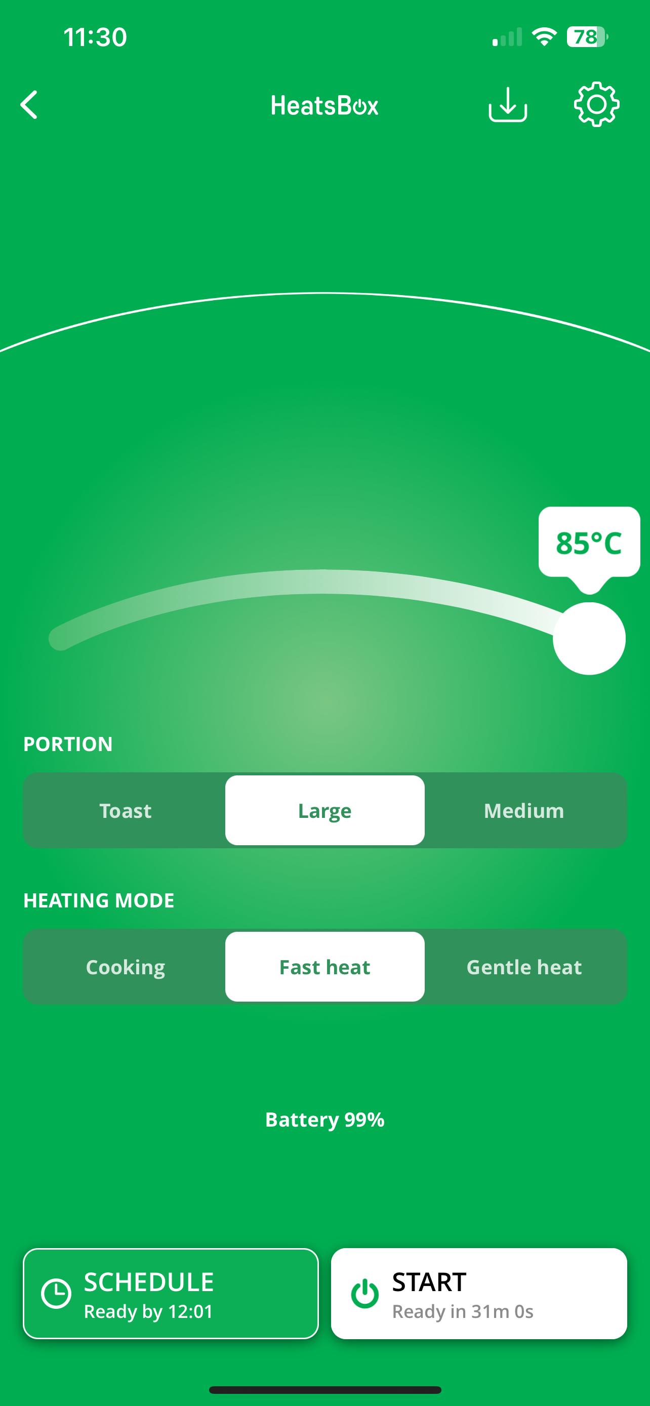 If you want your meal to be ready at a certain time - just schedule it. Make sure the button turns yellow. Once it is scheduled, it works without Bluetooth! HeatsBox will start heating automatically and you will have your hot meal on time.